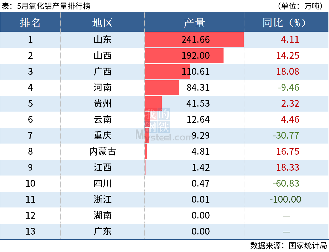 國家統(tǒng)計(jì)局?jǐn)?shù)據(jù)顯示,2022年5月全國氧化鋁產(chǎn)量698.8萬噸,1-5月氧化鋁產(chǎn)量3235.1萬噸。其中,前5月山東氧化鋁產(chǎn)量同比下降6.58%,山西和廣西氧化鋁產(chǎn)量分別同比增長9.33%和7.65%。