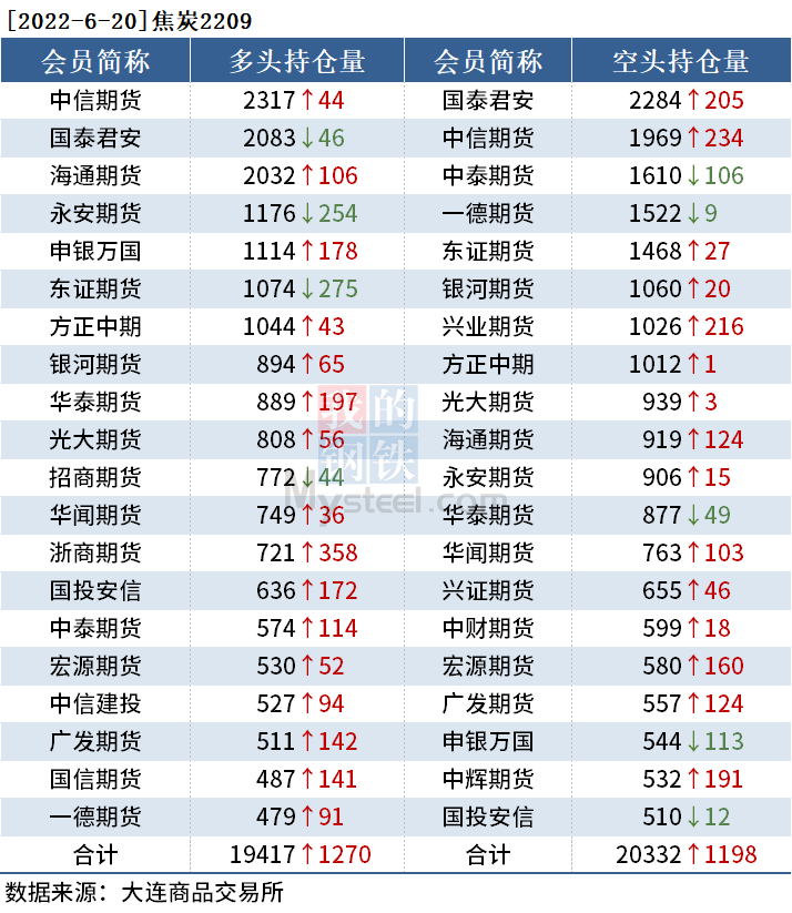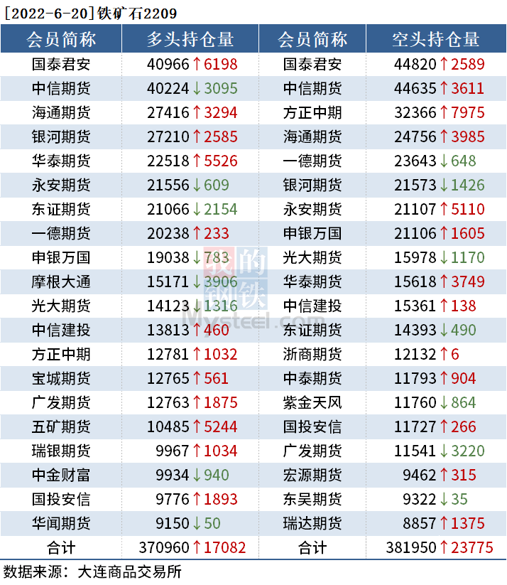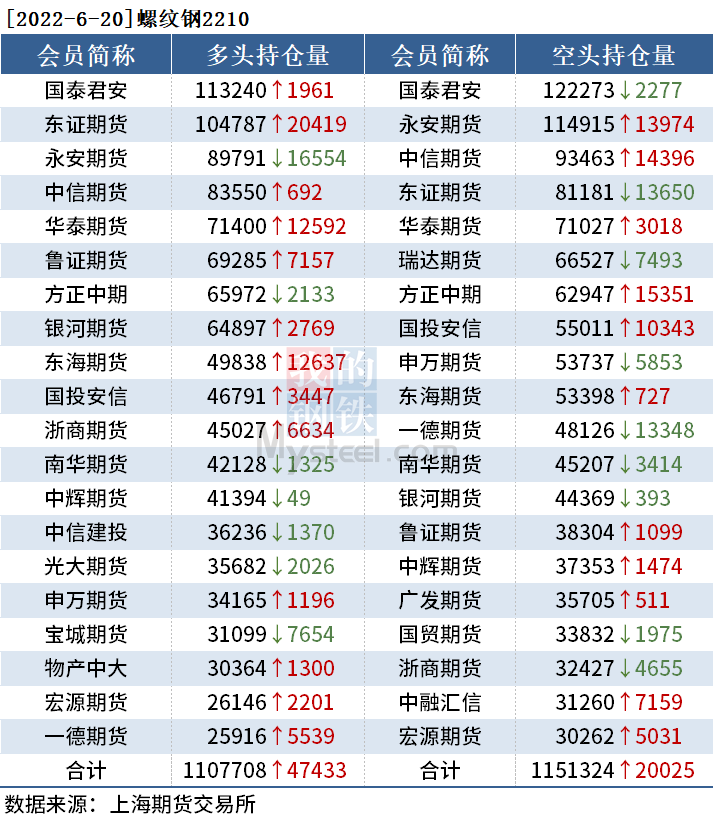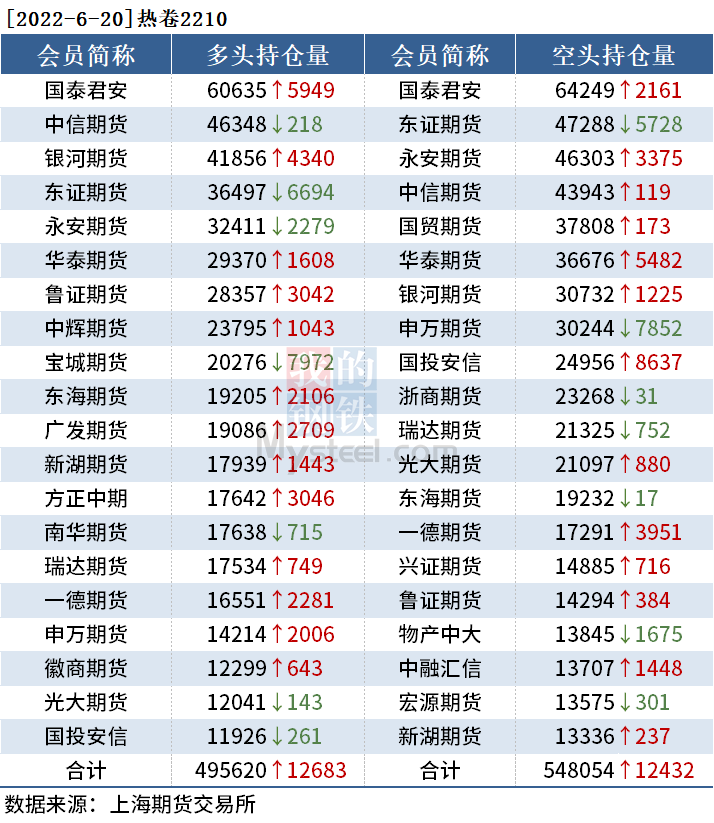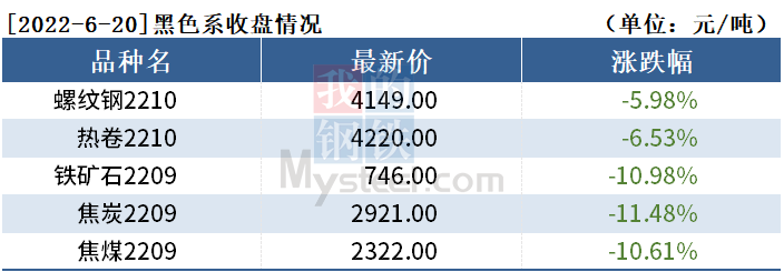 截至6月20日收盤,螺紋鋼2210收4149元/噸,跌5.98%;熱卷2210收4220元/噸,跌6.53%;鐵礦石2209收746元/噸,跌10.98%。