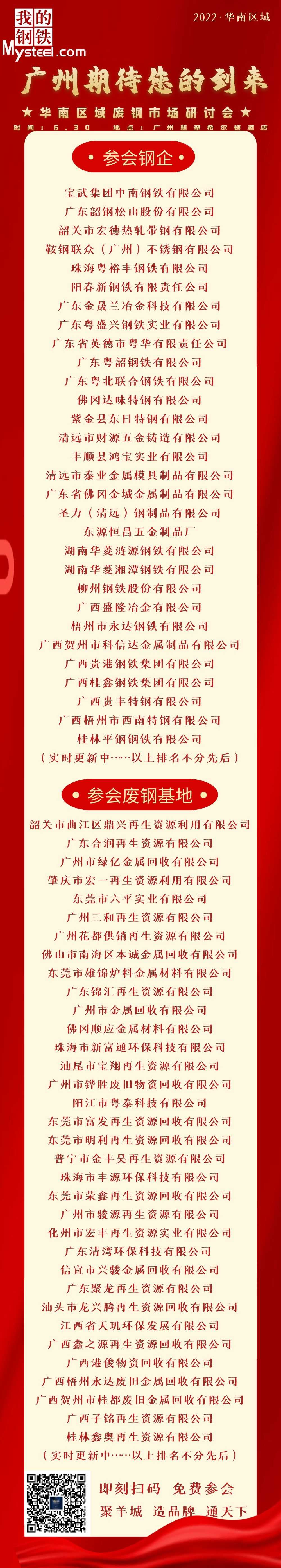 2022廢鋼全國行·華南區(qū)域廢鋼市場研討會(huì)。由上海鋼聯(lián)電子商務(wù)股份有限公司主辦、韶關(guān)市曲江區(qū)鼎興再生資源利用有限公司聯(lián)合主辦,中國廢鋼鐵應(yīng)用協(xié)會(huì)指導(dǎo),江蘇華宏科技股份有限公司、湖北力帝機(jī)床股份有限公司、江蘇大圣博環(huán)??萍脊煞萦邢薰竟餐瑓f(xié)辦,臨沂朱氏偉業(yè)再生資源設(shè)備有限公司白金贊助,江陰市宏力液壓科技有限公司黃金贊助的“2022廢鋼全國行·華南區(qū)域廢鋼市場研討會(huì)”將于2022年6月30日在廣州黃埔區(qū)翡翠希爾頓舉行,我們誠摯地邀請您出席本次會(huì)議。