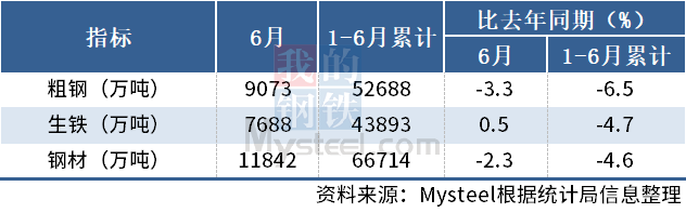 6月,中國粗鋼產(chǎn)量9073萬噸,同比下降3.3%;生鐵產(chǎn)量7688萬噸,同比增長0.5%;鋼材產(chǎn)量11842萬噸,同比下降2.3%。