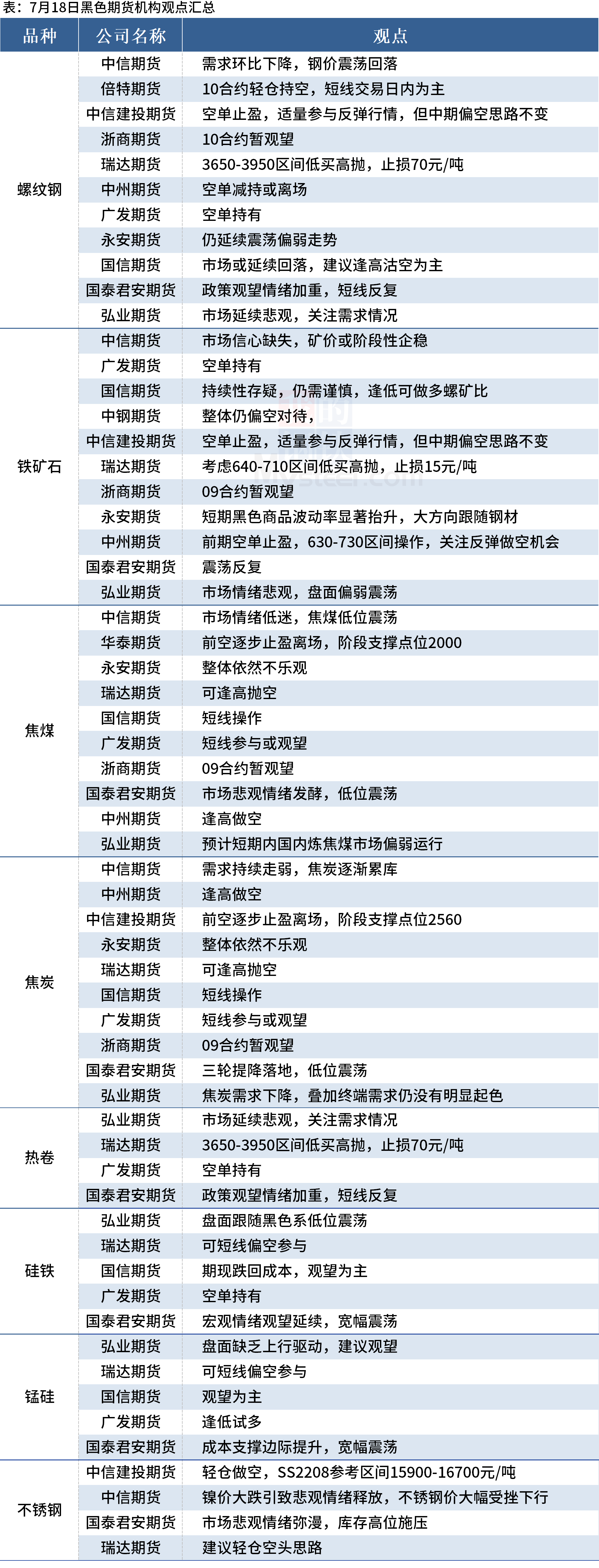 據(jù)Mysteel統(tǒng)計(jì)7月18日13家期貨機(jī)構(gòu)操作策略,其中多數(shù)機(jī)構(gòu)看空螺紋鋼,預(yù)計(jì)鐵礦石偏弱震蕩,焦煤、焦炭低位震蕩,建議暫觀望。具體匯總內(nèi)容如下: