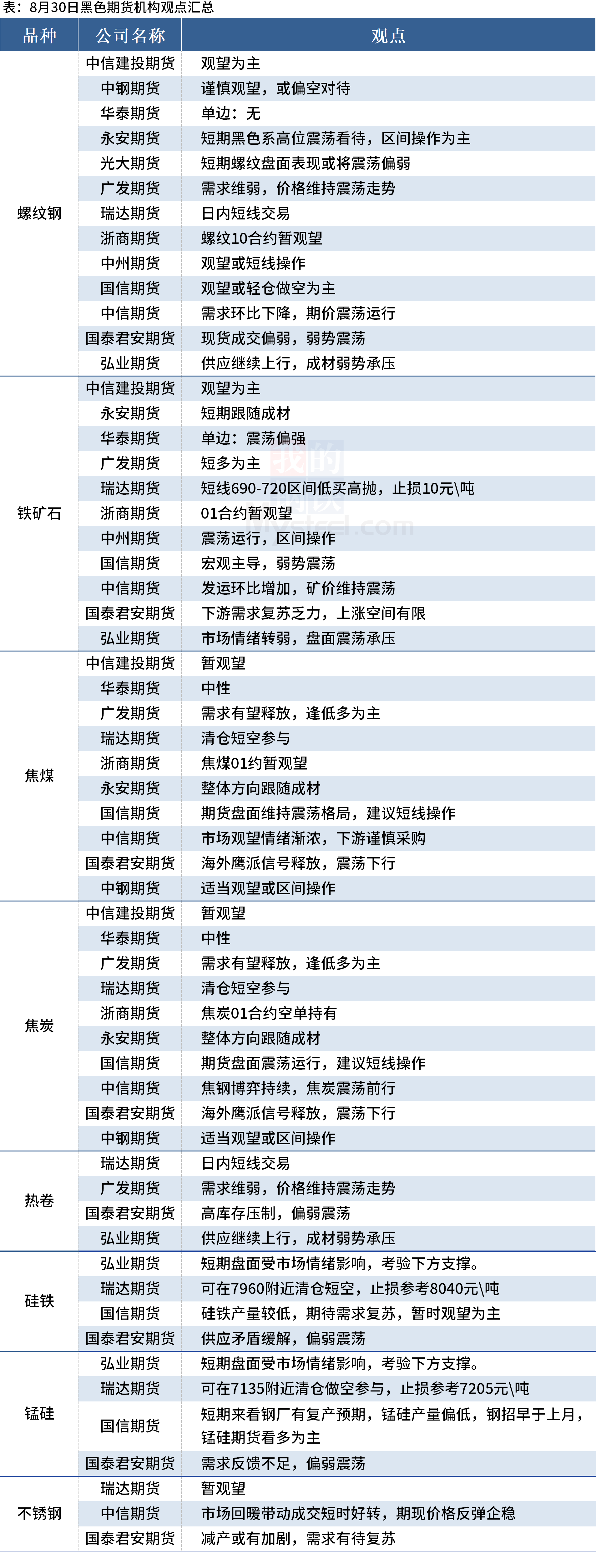 據(jù)Mysteel統(tǒng)計8月30日13家期貨機(jī)構(gòu)操作策略,其中多數(shù)機(jī)構(gòu)料螺紋鋼震蕩偏弱,建議鐵礦石震蕩運行,焦煤、焦炭震蕩運行。具體匯總內(nèi)容如下:
