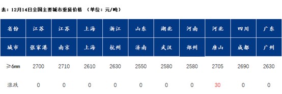 14 日國(guó)內(nèi)主要鋼材品種價(jià)格漲跌互現(xiàn),其中螺紋鋼均價(jià)較上一交易日價(jià)格上漲3元/噸:中厚板均價(jià)較上一交易日價(jià)格保持不變;角鋼均價(jià)較上一交易日價(jià)格下跌 11 元/噸;槽鋼均價(jià)較上一交易日下跌 11 元/噸。具體來(lái)看,早盤期鋼窄幅震蕩運(yùn)行,上午國(guó)內(nèi)鋼材價(jià)格主流持穩(wěn)。成交方面,早盤成交情況整體一般,午后隨著期鋼拉升,市場(chǎng)剛需成交有所好轉(zhuǎn),低價(jià)資源逐步消失,成交價(jià)格小幅跟隨上漲,全天成交好于上一交易日。在淡季背景下,市場(chǎng)呈現(xiàn)供需雙降的格局,疊加貿(mào)易商冬儲(chǔ)的積極性不是很高,因此預(yù)計(jì)短期國(guó)內(nèi)鋼材價(jià)格將延續(xù)窄幅震蕩運(yùn)行態(tài)勢(shì)。