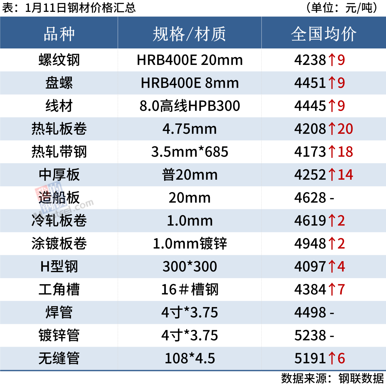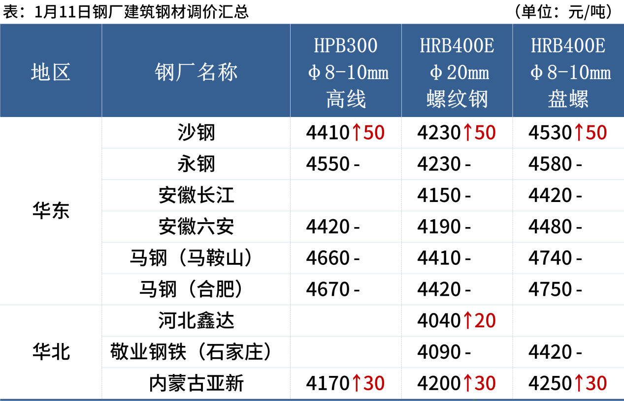 1月11日,3家鋼廠上調(diào)建筑鋼材出廠價20-50元/噸。