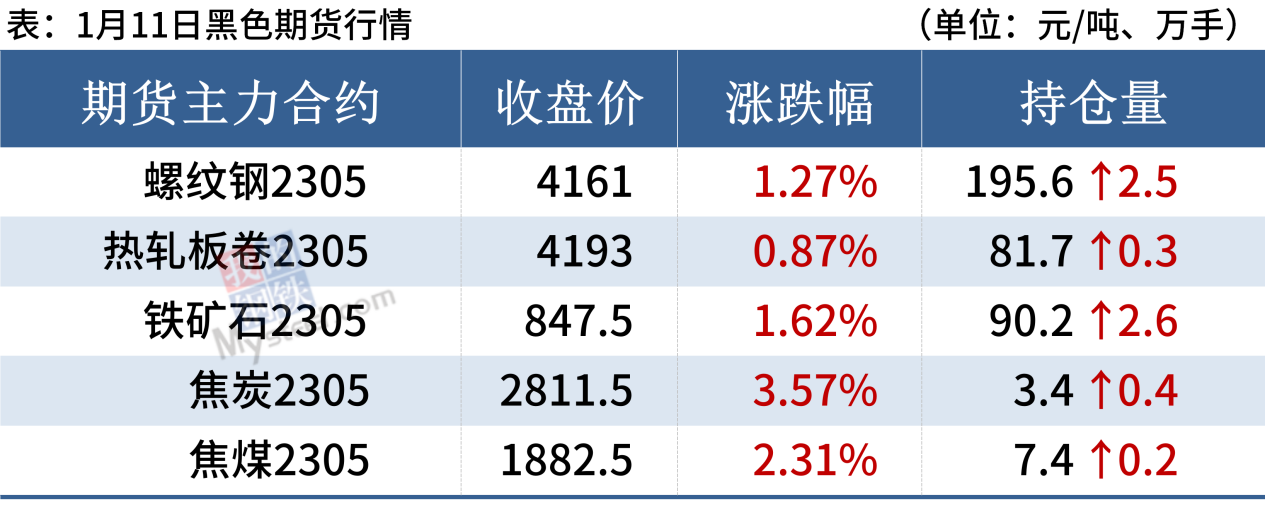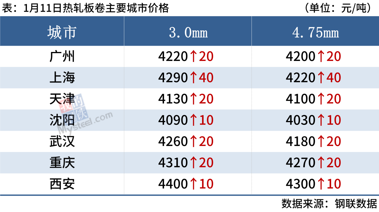 熱軋板卷:1月11日,全國24個主要城市4.75mm熱軋板卷均價4208元/噸,較上個交易日上漲20元/噸。隨著大部分鋼貿(mào)放假離場,表需和成交季節(jié)性下滑,且由于擔心節(jié)后行情走勢,多數(shù)商貿(mào)為被動冬儲。另一方面,節(jié)前實際成交低迷,但宏觀預期向好,房產(chǎn)利好政策不斷出臺,短期熱卷價格或?qū)⒗^續(xù)走高。綜合來看,預計熱軋板卷價格或?qū)⑵珡娺\行。