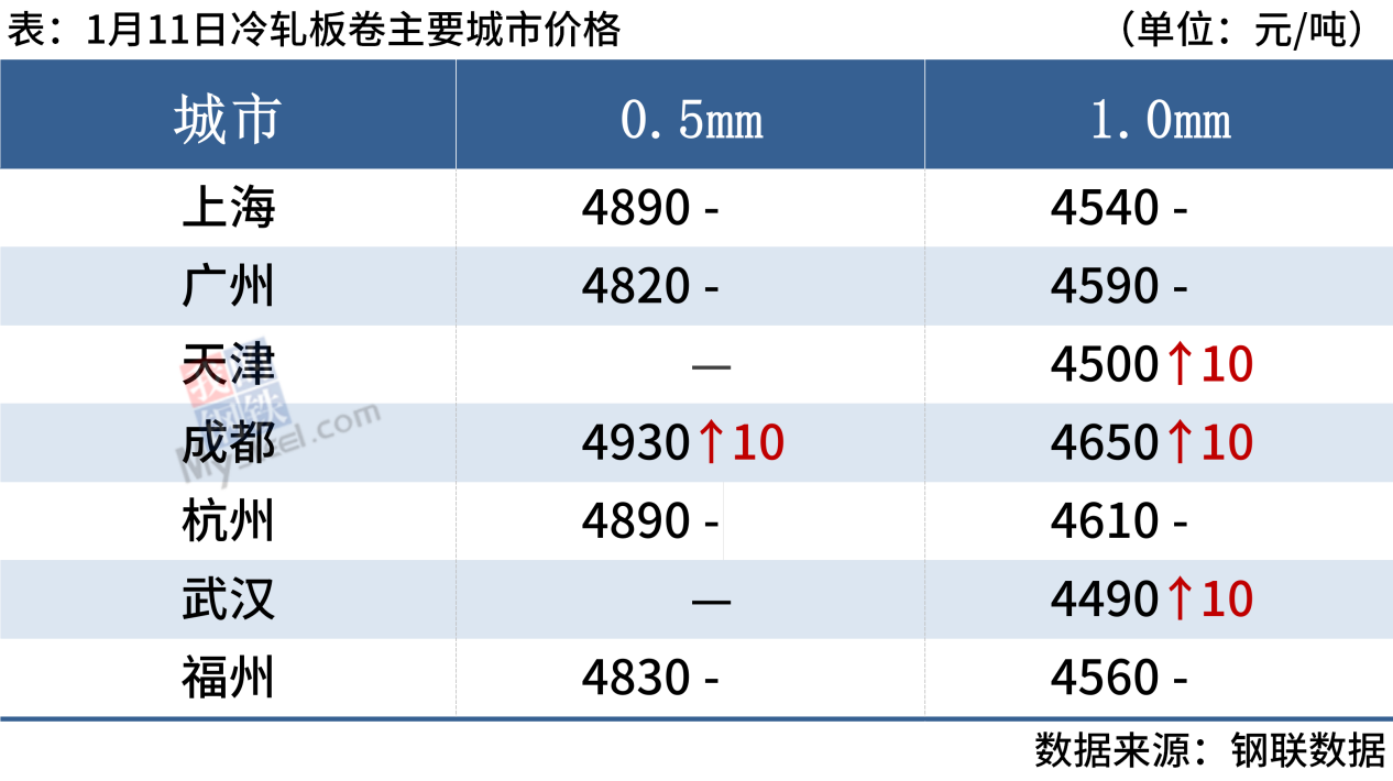 冷軋板卷:1月11日,全國24個主要城市1.0mm冷卷均價4619元/噸,較上個交易日上漲2元/噸。盡管臨近放假,但是生產(chǎn)端價格持續(xù)上行,多數(shù)商家在成本較高以及對后市預期較強的情況下,近些天報價基本以穩(wěn)為主或者跟隨期貨小幅探漲,而部分商家為盡量避免庫存增速較快,暗走出貨。成交方面,本周終端客戶已經(jīng)陸續(xù)放假,市場交投氛圍較為冷清,華南市場冷軋板卷大戶成交基本集中在200噸左右。另外,近期價格多隨期貨調(diào)整,市場基本處于有價無市的狀態(tài),商家整體情緒較為低迷。綜合來看,預計12日國內(nèi)冷軋板卷價格或?qū)⒁苑€(wěn)為主。