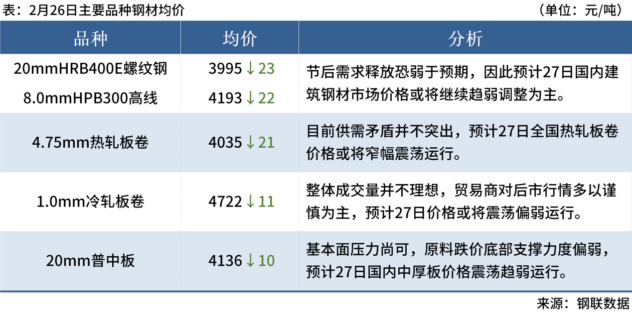 ◎ 2月26日,全國主港鐵礦石成交69.50萬噸,環(huán)比增13%;237家主流貿(mào)易商建筑鋼材成交5.38萬噸。