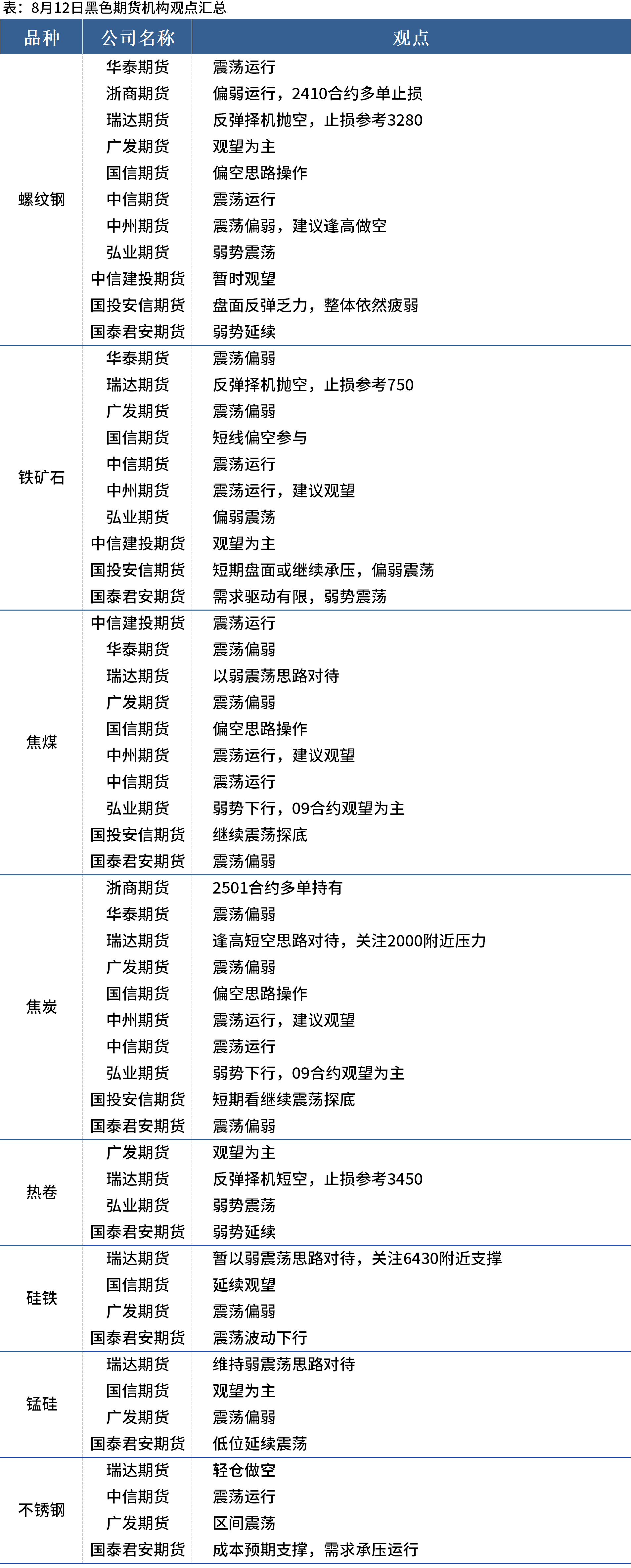 據(jù)Mysteel統(tǒng)計(jì)8月12日11家期貨機(jī)構(gòu)操作策略,其中多數(shù)機(jī)構(gòu)料螺紋鋼震蕩運(yùn)行,鐵礦石弱勢(shì)震蕩,焦煤、焦炭震蕩偏弱。具體匯總內(nèi)容如下: